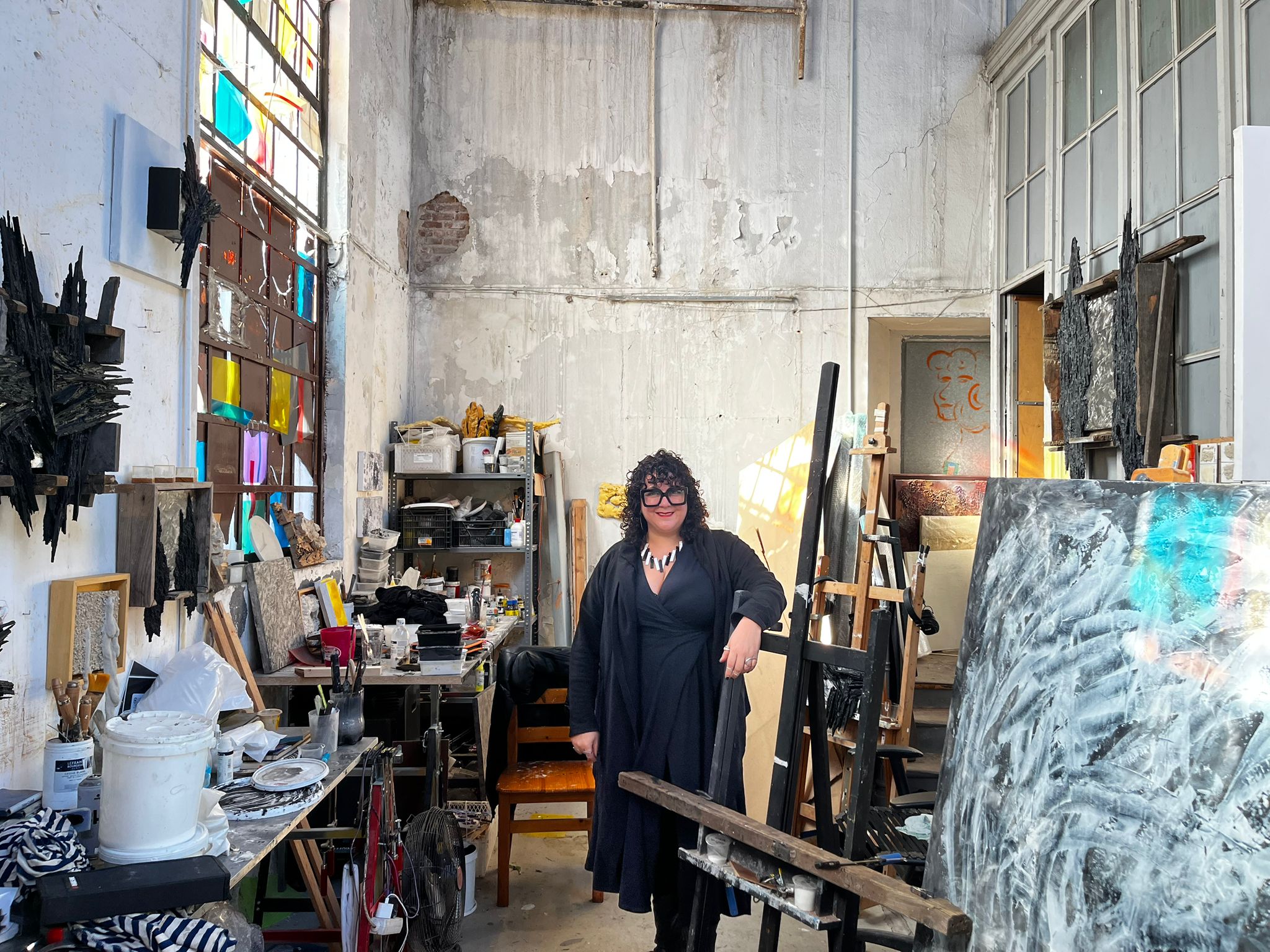 A su entrada me recibe Trini Energici (43), artista visual chilena, residente en España desde 2018, que tiene su taller dentro de las instalaciones del museo. Trini es diseñadora industrial de profesión, y comenzó a pintar a los 35 años, profesionalmente a los 37. Su obra se puede catalogar como pintura matérica: utilizando materiales como madera, carbón, poliuretano, entre otros. Su pintura escapa del bastidor como soporte, lo revienta, reconfigura y supera. Es abstracción háptica; presenta texturas y formas que, sin describir, sugieren e interpelan al su espectador. La materia parece haber brotado, desbordándose a sí misma para encontrar su forma actual. Con un café en la mano, nos sentamos en su taller. Rodeándola, están sus obras terminadas y en progreso. Apunto de terminar una que se encuentra tras ella. Es una erupción blanca, una herida desgarrada que se niega a cerrarse. Comenzamos a conversar.